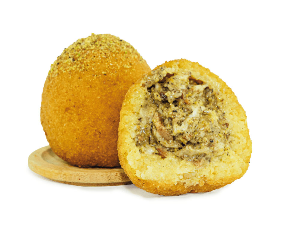 Un arancini original qui mêle douceur, caractère et gourmandise. Au cœur, une saveur de pistache, associée à des dés de pancetta et de la provola fondante. Le riz moelleux enrobe cette farce généreuse aux saveurs du sud de l’Italie et la panure croustillante vient parfaire l’équilibre entre fondant et croquant. Un arancini raffiné et surprenant, entre tradition et créativité.