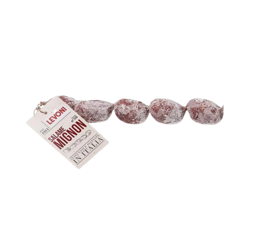 Les mini saucissons Mignon de Levoni, parfaits pour une dégustation gourmande. Grâce au poivre noir concassé, ils offrent une texture agréable en bouche et un équilibre subtil. Leur arrière-goût intrigant, relevé d’une légère touche épicée, en fait une charcuterie aussi surprenante qu’addictive. Idéals pour l’apéritif, ils raviront les amateurs de saveurs authentiques.